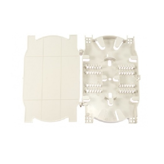 Cassette porta empalmes para bandejas de fibra de material plastico para 24 fibras, incluye 2 peines para fijar 12 fusiones en cada uno. Dispone de tapa para proteger las fusiones.